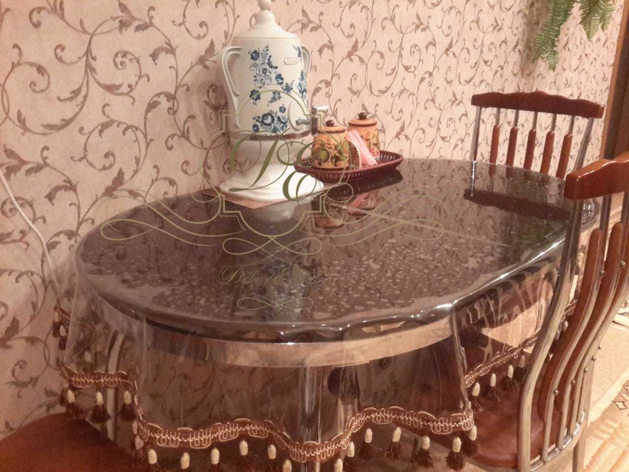 Некоторые домашние хозяйки прилагают множество усилий для украшения скатерти. Один из таких способов — это отделка прозрачной скатерти из силикона бахромой или тесьмой. Кстати, силиконовые скатерти с бахромой серийно производят и некоторые изготовители этого кухонного атрибута.