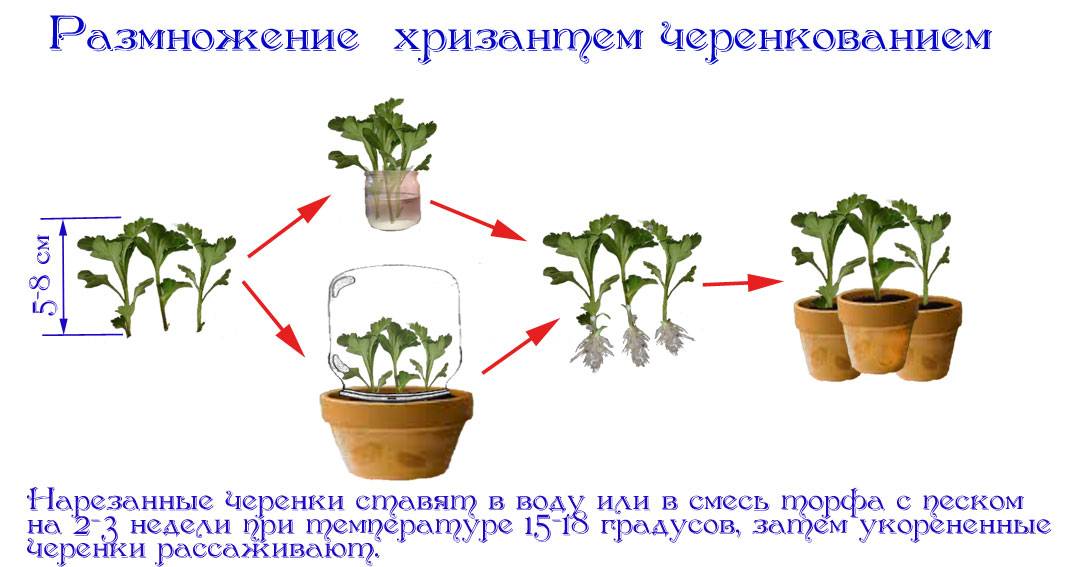 Черенки хризантем срезают как весной, так и осенью. Длина черенка – 3–4 междоузлия, нижние листья обрывают, оставляя только верхние. Такие зелёные ветки пускают корни даже в обычной воде. Но чтобы увеличить выживаемость черенков, их можно опудрить «Корневином» (работать в перчатках и респираторе), воткнуть в слегка увлажнённую землю и прикрыть стеклянной банкой. Пустившие корни черенки рассаживают по горшкам. К осени из них вырастут полноценные кусты.
