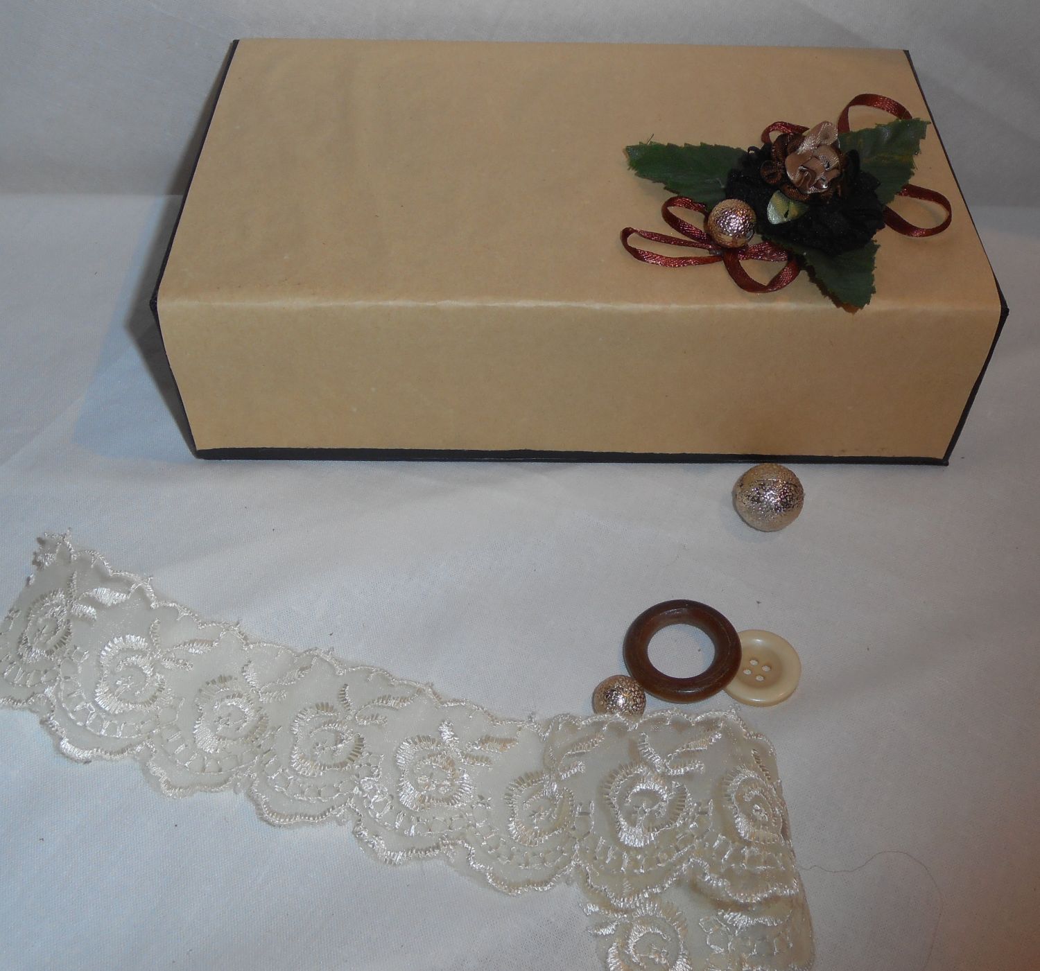 Далее задекорируйте шкатулку бусинами, пуговицами и т.п. по своему усмотрению. Пуговицу можно прошить нитками, подходящего цвета, так создастся дополнительный акцент, и пуговица будет смотреться эффектнее.