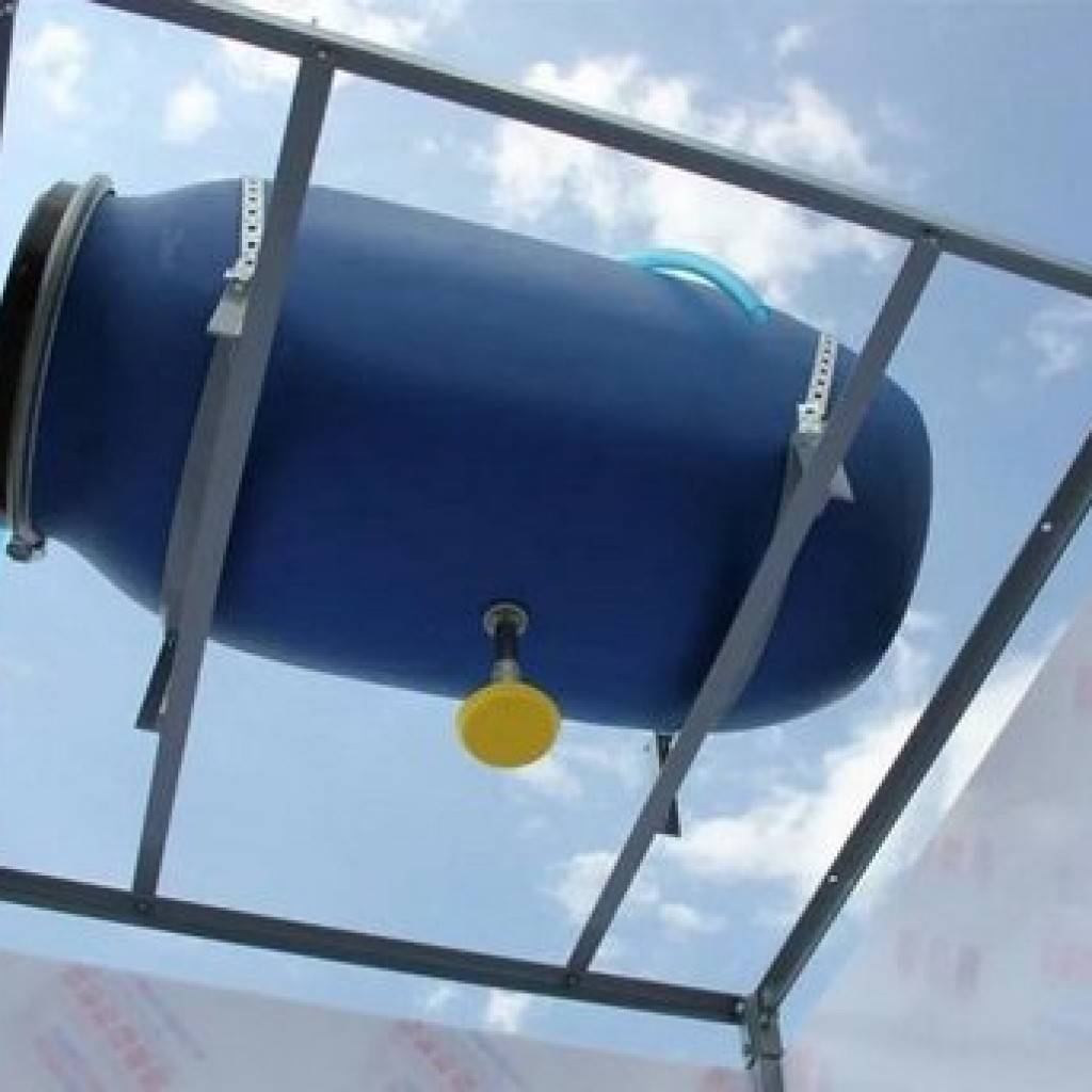 - Растянутая над баком незамысловатая конструкция из реек и полиэтиленовой пленки, позволяет нагреть в нем воду на 10 °С и выше;