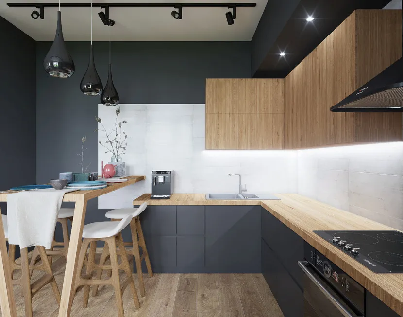Если геометрия кухни позволяет, очень советуем барную стойку, они в моде уже так давно, что скорее всего из неё и не выйдут. Можно сделать её широкой и получится барный стол, там выше материал с кучей подробностей, в рамках этой статьи про барную стойку информация уже не влезет.