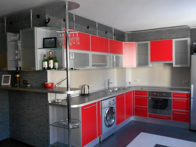 - Если кому-то требуется совместить кухонную зону с гостиной, очень кстати будут гарнитуры с барной стойкой, прекрасно зонирующей пространство.
