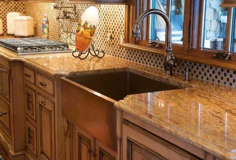 Мойка в один уровень со столом устанавливается за счет паза, который выфрезеровывают в столешнице. Края столешницы обязательно обрабатывают и полируют. Выглядит такая мойка оригинально, но стоит дороже, а установка занимает больше времени.