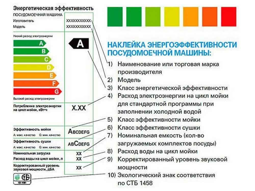 ПММ классифицируют не по мощности, а по энергопотреблению. На всех крупных бытовых приборах наклеены бирки, где указывается уровень энергоэффективности моделей различных марок – Bosch, Siemens, Electrolux и многих других. Информация на бирках почти всех изделий систематизирована одинаково (см. рис.).
