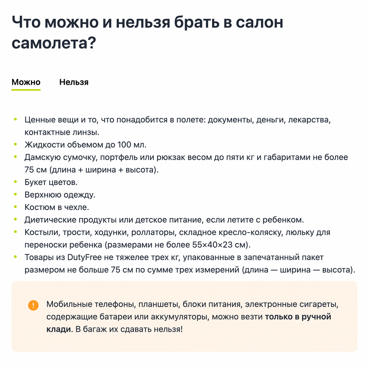 По предварительному согласию с авиаперевозчиком допускается провоз дополнительного комплекта литий-ионного аккумулятора не в составе устройства, а также ноутбуков, чья мощность составляет 100-160 Втч.