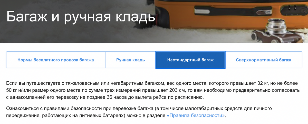 Обязательно перед поездкой поинтересуйтесь наличием данной информации, помимо обязательного уточнения конкретных норм на бесплатный перевозимый багаж, на выбранную вами авиалинию.
