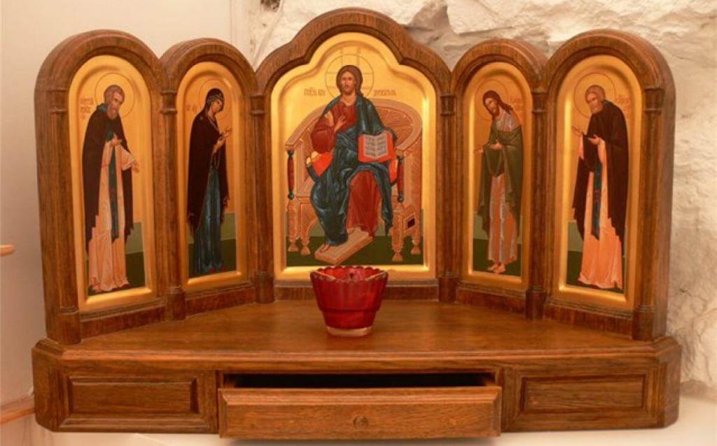 Иконостас создается по подобию церковного. Непременно с иерархическим расположением образов: по центру – Спаситель с Божьей Матерью (Спаситель справа от нее!), в том же ряду может располагаться Святая Троица (либо выше всех изображений). Если Троицы нет – вверху иконостаса располагают распятие. Все иные изображения подчиняются данным ключевым иконам: справа от Спасителя ставят образ Иоанна Предтечи. Данный триптих – это Деисус (прим. моление, основа). Дальше следуют святители, преподобные и прочие иконы (например, местных святых или именные), которые выбирает православный по собственному желанию. Святых не ставят выше Деисуса, апостолов, Троицы.