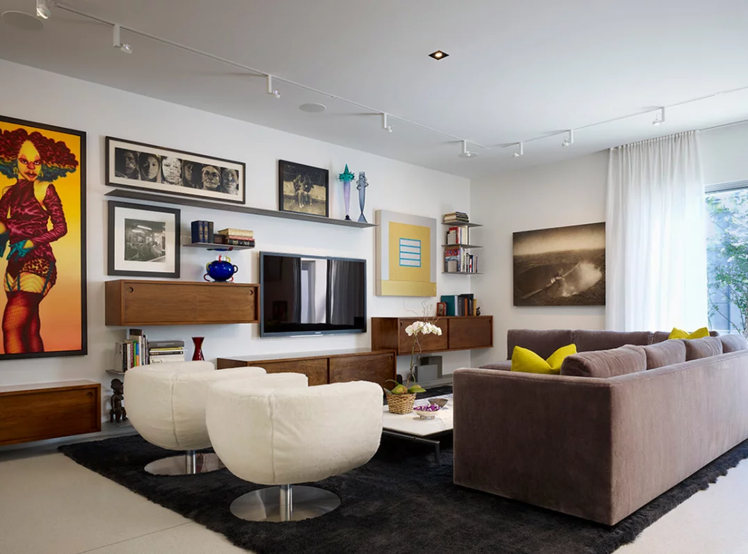 Большинство времени люди проводят именно в гостиной. Здесь принимают гостей и родственником. Семьи собираются за просмотром любимых сериалов и фильмов. Прикрутите кронштейн в середине комнаты для удобного просмотра с любой точки. Присядьте на диван или кресло и подумайте, как удобнее будет смотреть. Чувствуете дискомфорт или искажение картинки? Замените месторасположение подставки.