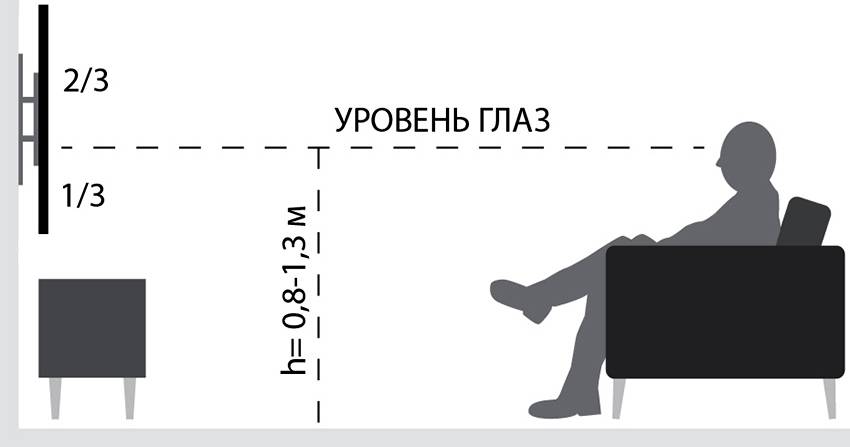 Совет: проведите эксперимент. Посадите каждого члена семьи на место просмотра, попросите его закрыть глаза, расслабиться и открыть. Отмечайте место соприкосновения глаз с противоположной стеной. В итоге сравните каждую точку и выберите саму идеальную между ними.