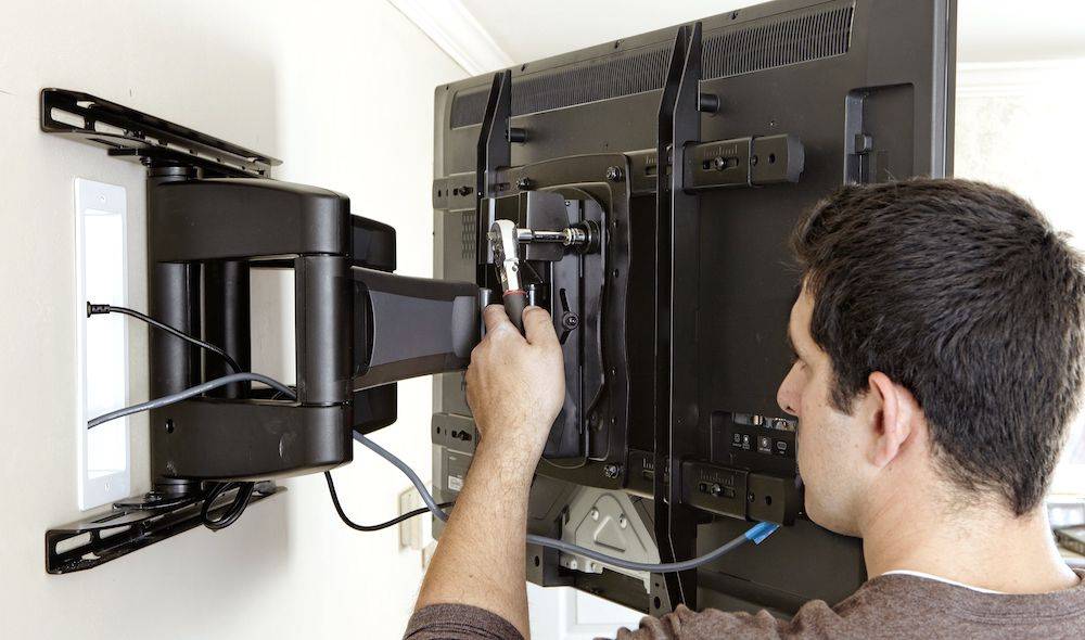 Процесс установки телевизора на стену – довольно простое мероприятие. Для этого понадобится перфоратор и выбранный элемент крепления. Любая модель кронштейна комплектуется необходимым набором крепежных деталей для надежной фиксации устройства на стене.