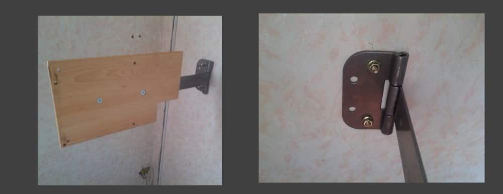 - Доска крепится к заранее просверленным отверстиям в длинной поворотной полосе петли (короткая часть петли с опорной площадкой, имеющей четыре отверстия, длинными и мощными саморезами или анкерными болтами уже закреплена к стене);