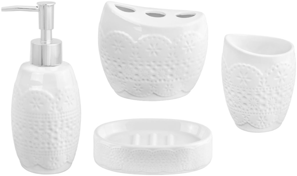 Набор ванных аксессуаров из серии «Кружево» представлена 4 стандартными предметами для ежедневного ухода. Материалом для создания набора послужил высококачественный фарфор, дополненный изящным рельефным орнаментом. Представленная коллекция сделает хранение гигиенических принадлежностей более удобным и эстетичным. А стильная упаковка позволяет использовать элементы в качестве подарка для любого случая.