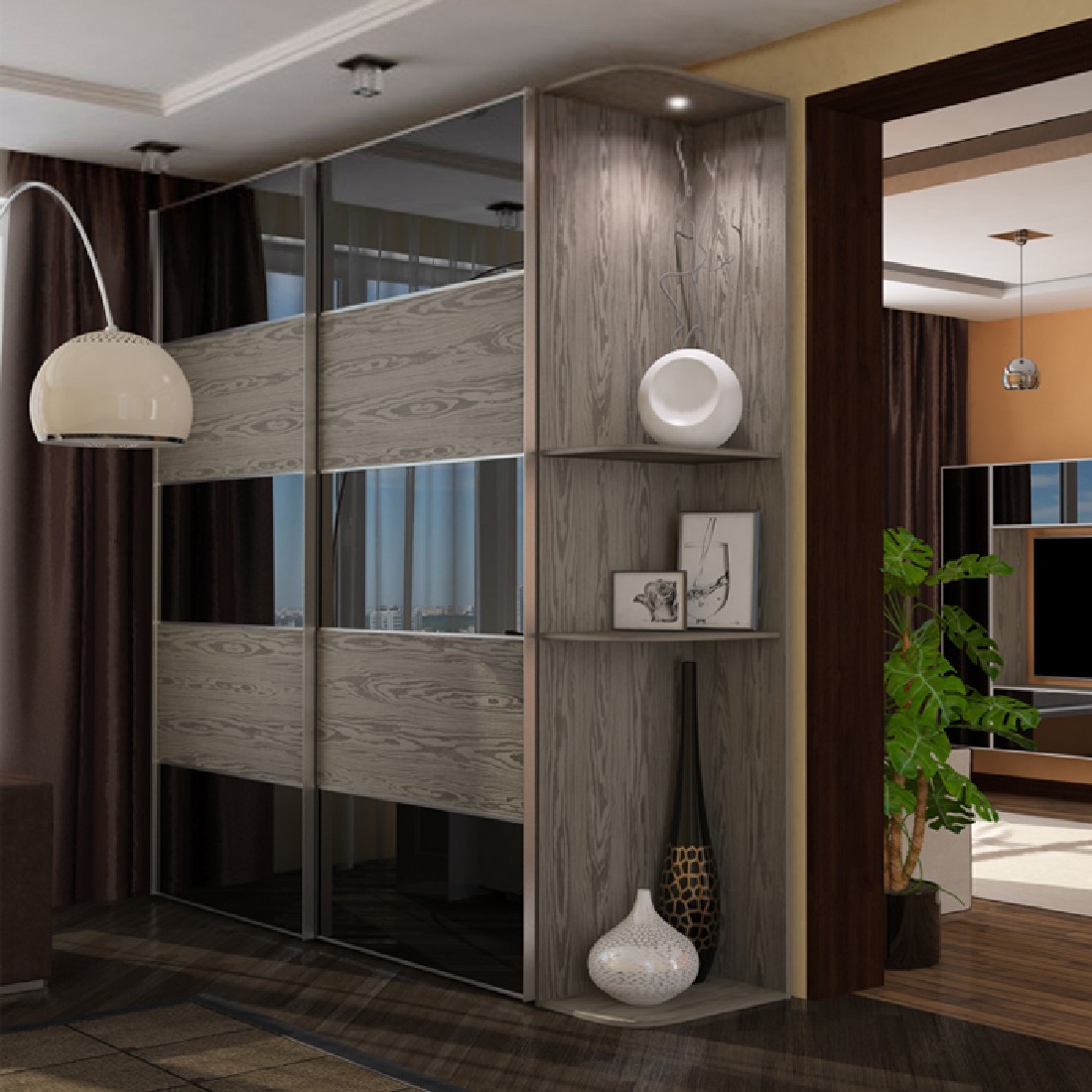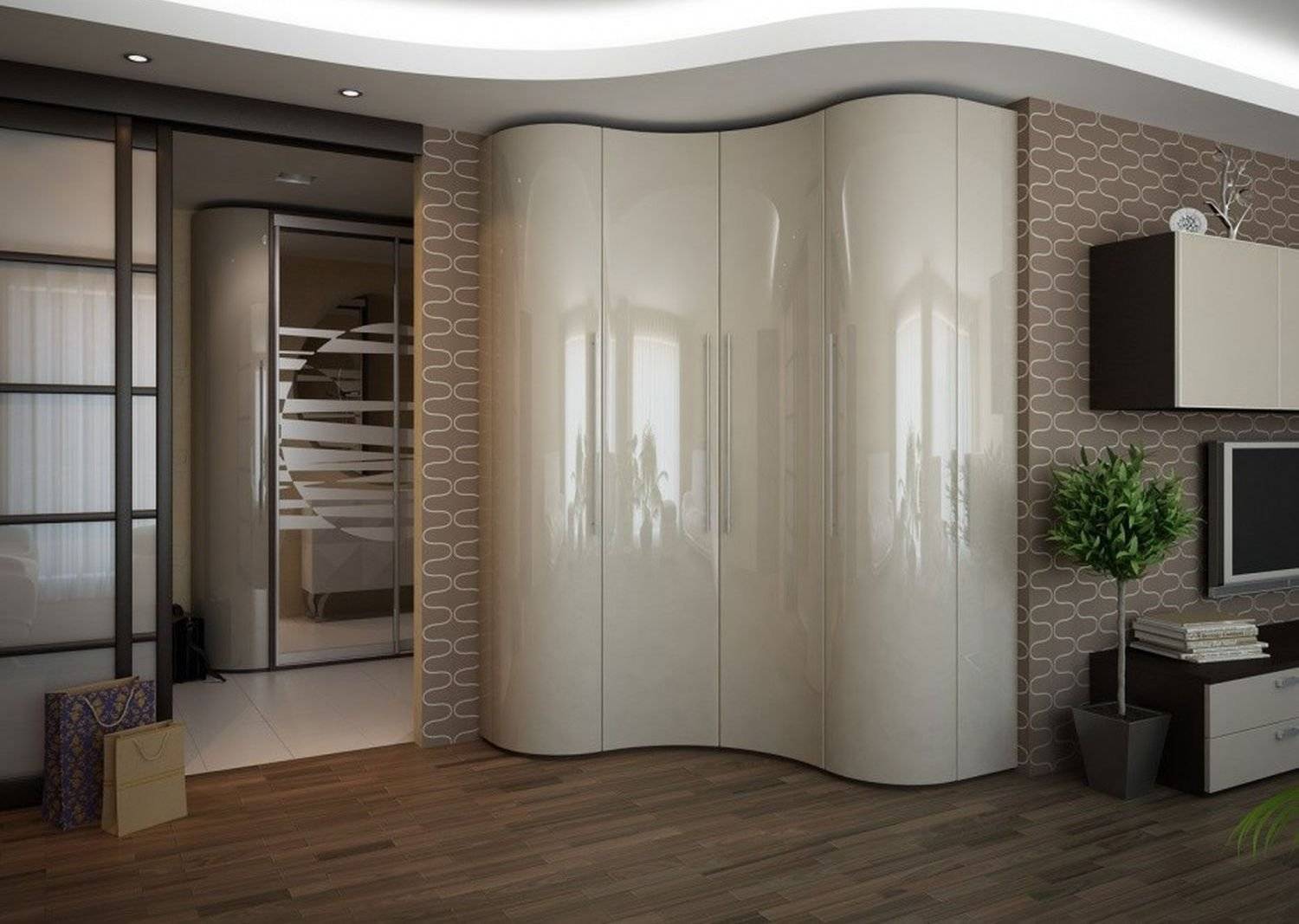 - радиальные — обычно встраиваются в углу, линия фасада скругленная, выгнутая, чтобы увеличить пространство внутри шкафа. Могут использоваться как компактные гардеробные.