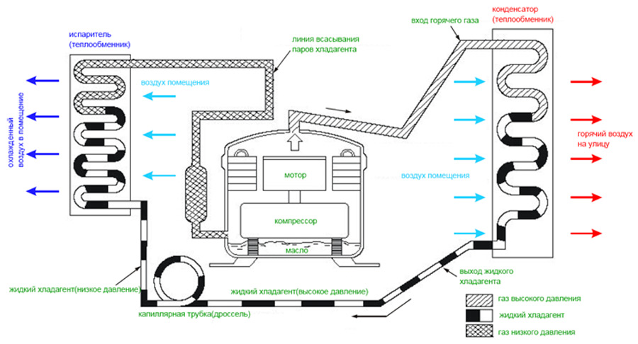 По системе циркулирует хладагент — фреон, нагнетаемый компрессором.