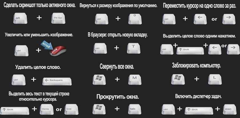 Есть и еще “секретные” комбинации клавиш, они еще называются “горячими” или глобальными и нужны для скорости ввода текста в редактор или управления командами на ПК: