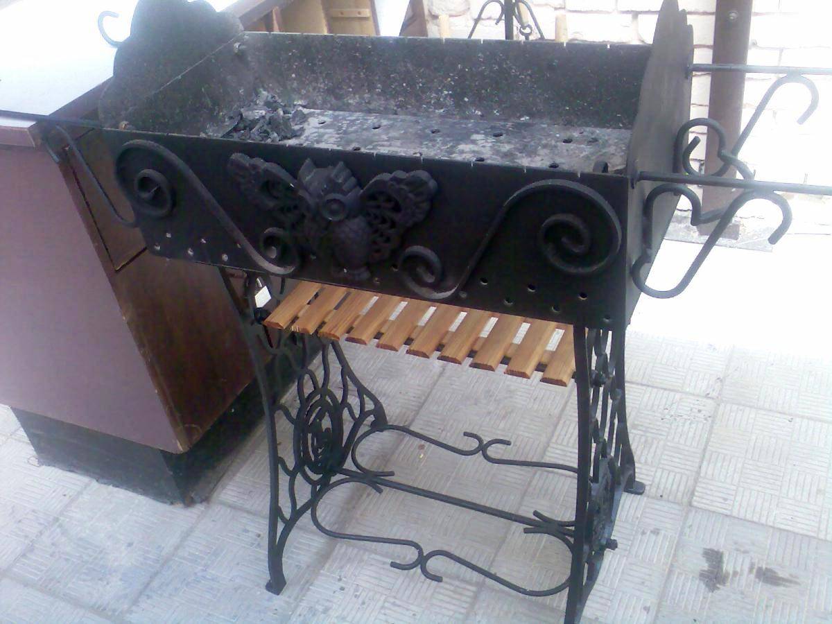 Чугунную станину от швейной машинки можно использовать в качестве основания для мангала. Сверху нужно сделать жаровню из металлического листа, которая будет размещаться на конструкции от швейной машинки. Таким образом, получается хороший мангал, который станет украшением любого сада или дачного участка и прослужит много лет.