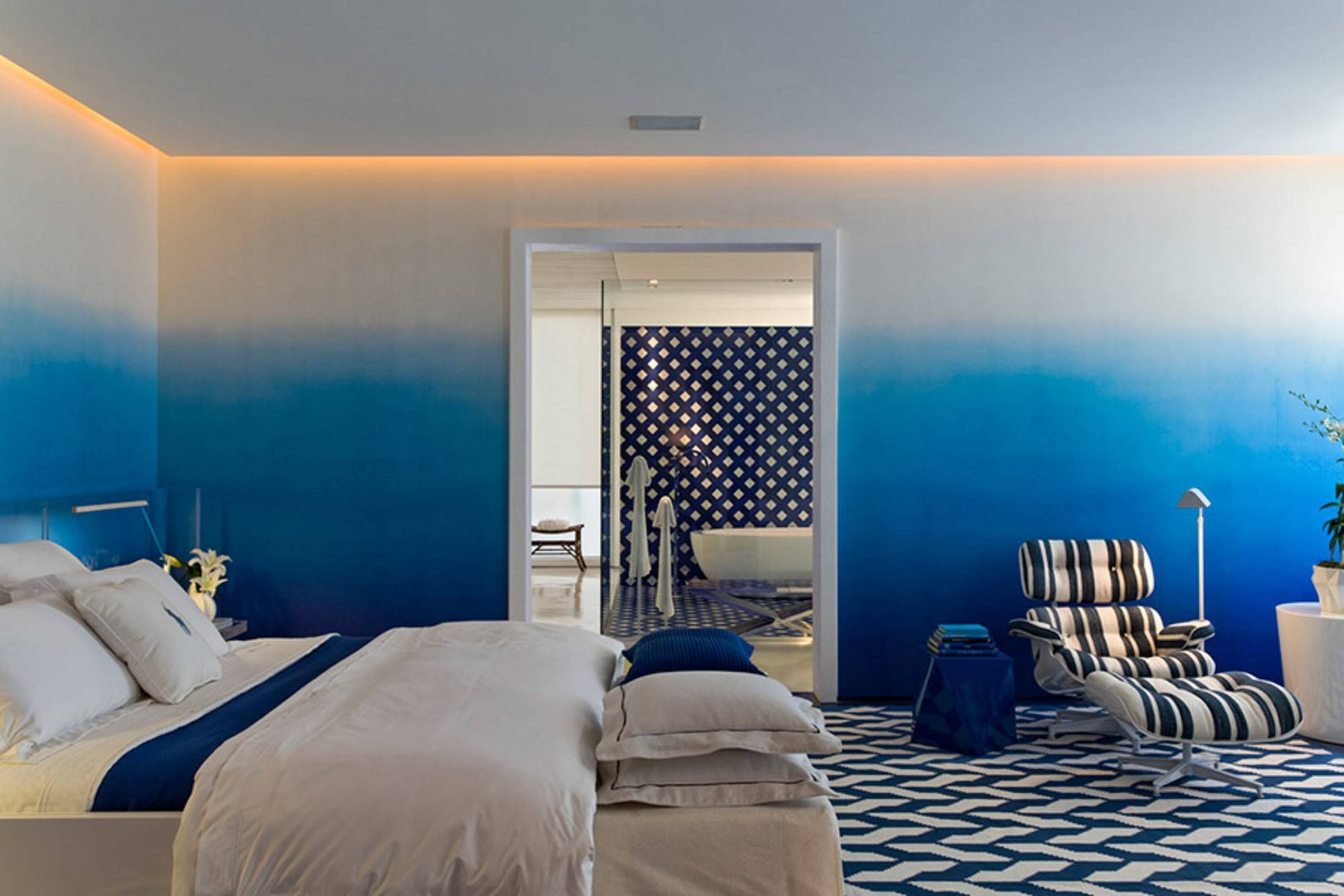 Или попробуйте вариант с градиентом. Это крутое решение для маленькой спальни. Когда темный цвет снизу постепенно переходит в светлый верх. В комнате с низкими потолками этот эффект будет смотреться особенно здорово.