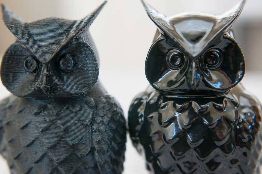 При паровой обработке деталь, как правило, находится в бане из испарений едкого растворителя, в случае с ABS – ацетона. Частицы испаряющегося вещества въедаются в обрабатываемую поверхность и оплавляют ее, из-за чего она становится гладкой и глянцевой (см. фото выше). Данный метод позволяет достичь визуальной целостности и максимально высокого качества поверхности, поэтому применяется для изготовления предметов повседневного спроса и прототипов.