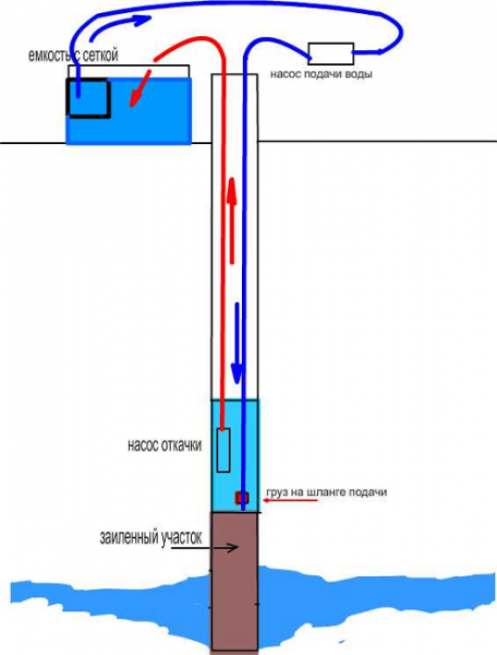 В ствол скважины опускается шланг с грузом или штанга. Она должна идти практически до самого дна, не доставая всего на 4-5 см. После этого опускается погружной насос, между дном и приемным окном фильтра делается зазор в 30-40 см длиной. Чистую воду из цистерны закачивают под давлением в шланг, жидкость размывает и подхватывает ил, грязь и даже мелкие камушки и идет через погружной насос наверх, в сборную цистерну. Периодически погружной насос вынимают, делают очистку фильтров и отправляют обратно.