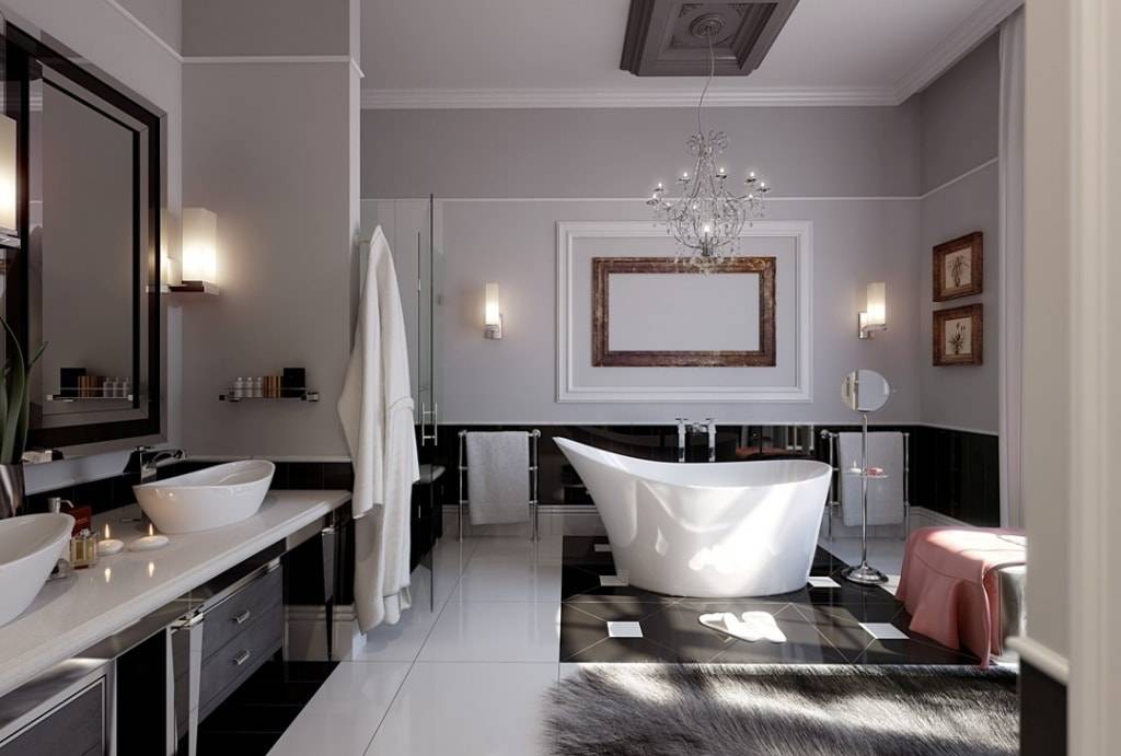 Современные минималистичные ванные комнаты идеально подходят для светильников простой, но не скучной формы, а для белых, женственных и романтичных интерьеров, выбирайте модели с более сложным декором.