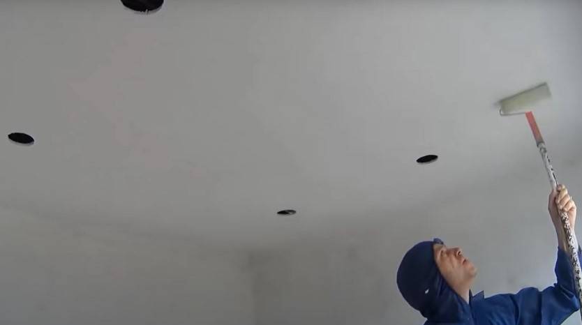 - После подготовки поверхности к окрашиванию необходимо обработать потолок специальной грунтовкой. Также можно использовать разбавленную краску. В этом случае, объем воды для разбавления не должен превышать 10%.