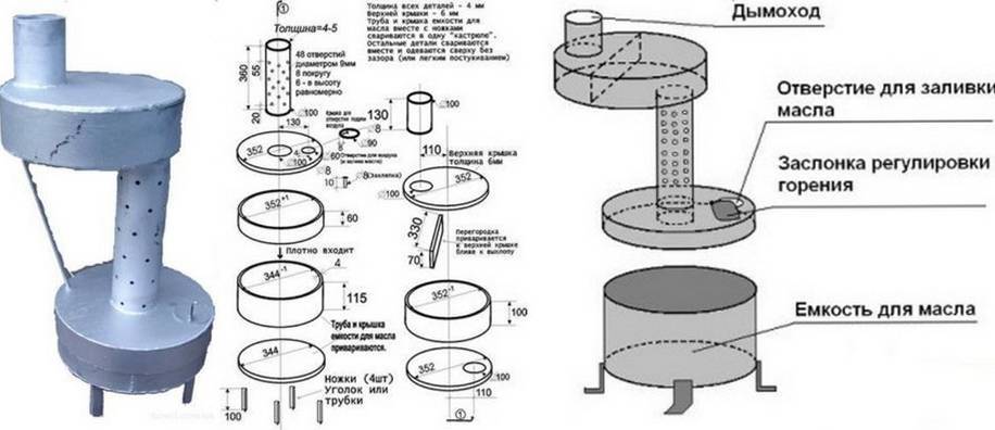 Конструкция агрегатов также подразумевает авторскую работу, от компактных приборов до крупногабаритных станций с высокой теплоотдачей. Элементы больших и маленьких печей, как и принцип работы идентичны. Основными элементами служат две емкости. Жидкое горючее заправляется в нижний резервуар с поверхностным розжигом. По перфорированной трубе пары горючего поднимаются к верхнему резервуару, в котором происходит их окончательное окисление. Перфорация трубы, соединяющей две емкости, обеспечивает доступ кислорода.