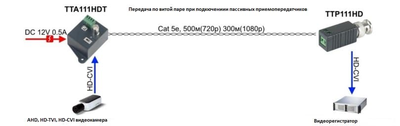 Такой принцип действия обеспечивает особая конструкция линии, в которую помимо самого кабеля, также входит пара «передатчик-приемник». Из этого оборудования передатчик отвечает за прием и преобразование несимметричного сигнала видеокамеры в симметричный. Дальше он усиливается и отправляется на приемник. В приемнике сигнал повторно усиливается и снова конвертируется в несимметричный вид.