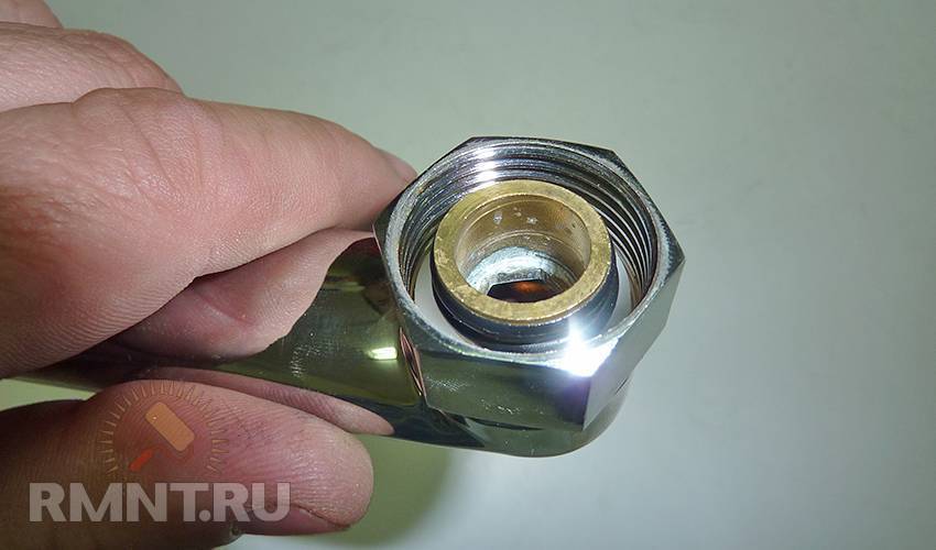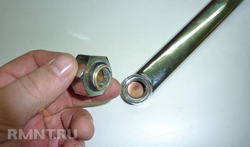 Для устранения этой неисправности в смесителе, который сломался, также необязательно применять инструменты. Нужно лишь открутить гайку, закрепляющую лейку на шланге, и заменить изоляционную прокладку.