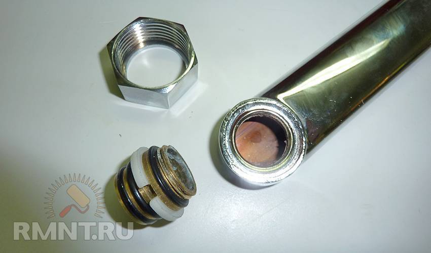 Для плоских изливов процесс демонтажа аналогичен — отворачиваем крепёжную гайку и снимаем излив. На внутренней части так же видны два уплотнительных кольца, которые нужно заменить.