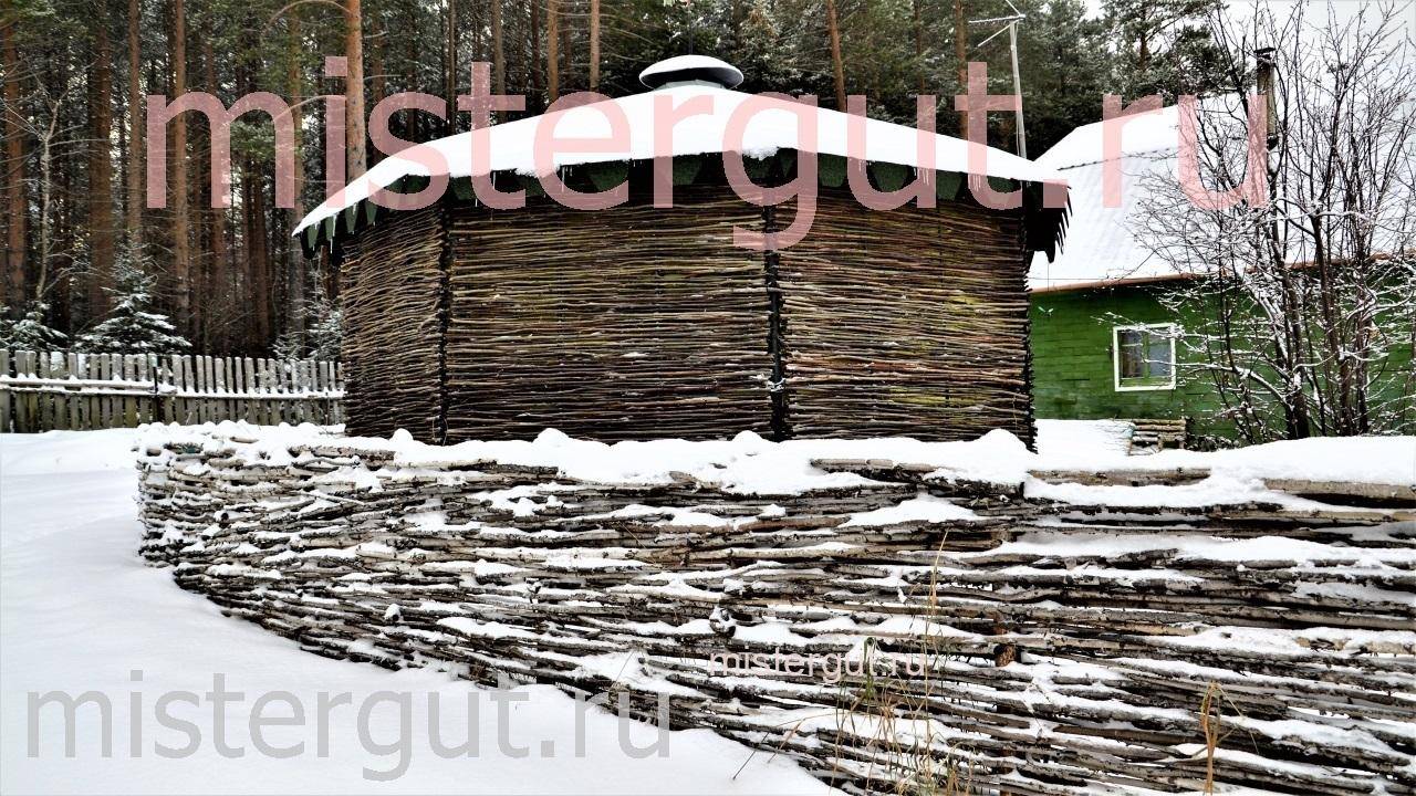 - Интересная особенность такого типа – дополнительные столбы. Делаются из стволов деревьев (толстых веток), расположенных на расстоянии через каждые 40см относительно основных опорных столбов. Такие стойки полуметрами выше, чем основные стойки. Вверху стоят по одной линии, для уверенности соединяют их прочной веревкой. Смысл такой конструкции — основные опоры вплетаются, их потом будет невидно. Дополнительные столбы ставят выше, поэтому будет казаться, что каркас держится только ими, однако это только видимость.