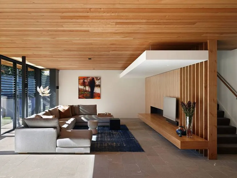 Светлый деревянный акцент на потолке и других поверхностях добавит тепла, не нагружая интерьер цветом. Так, выбеленный дуб идеально подойдет в любое жилое пространство, будет смотреться неброско и универсально.