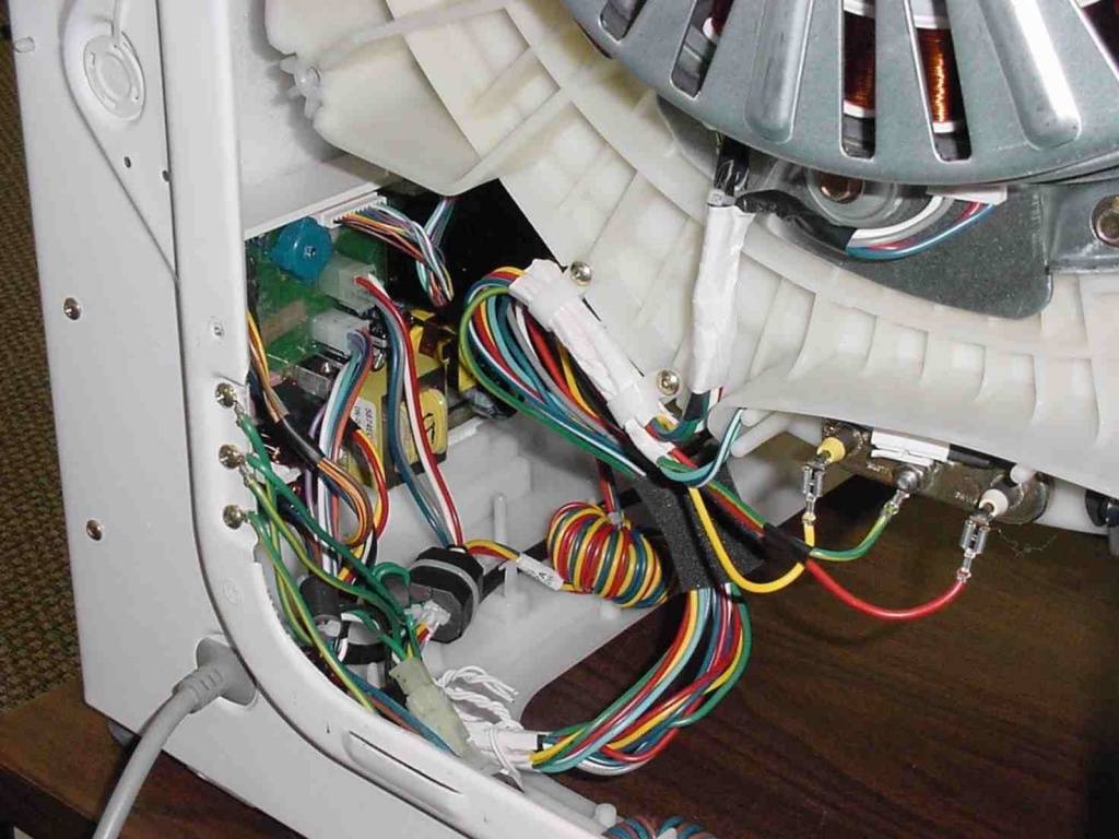 Во время работы стиральной машины некоторые провода могут соприкасаться с отдельными ее деталями. Такая ситуация может вызвать трение и обрыв проводов. Так же от вибраций они могут отключиться от гнезд креплений. Для того, чтобы обнаружить данную неисправность необходимо внимательно оглядеть все провода. Подобный осмотр даст возможность обнаружить данную неисправность. Так же можно «прозвонить» подозрительные места тестером.
