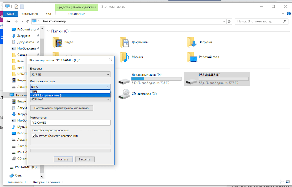 - Отформатировать флешку. Первым действием, если телевизор LG не видит флешку, является форматирование файловой системы. Для этого открываем «Этот компьютер» на ПК, жмем правой кнопкой мыши по флешке и выбираем «Форматировать». Предлагаем выбрать вариант ExFAT. Эта файловая система поддерживается большинством устройств, а также не имеет ограничений по объему накопителя.