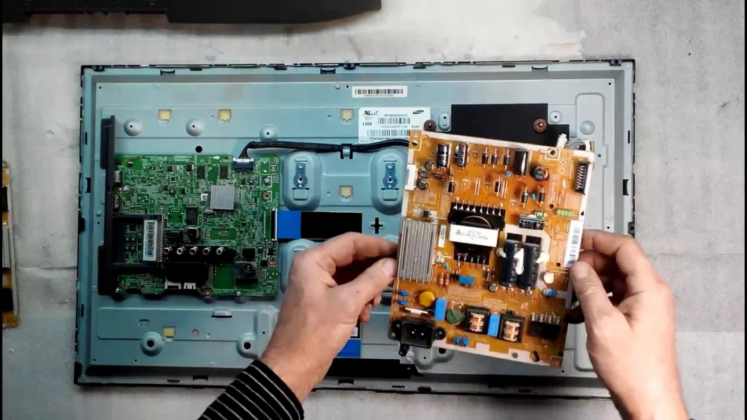 Для начала нужно отключить телевизор от сети и снять заднюю панель. Делать это нужно чрезвычайно аккуратно, поскольку к ней могут быть прикреплены шлейфы и другие комплектующие. Далее необходимо провести визуальный осмотр комплектующих.