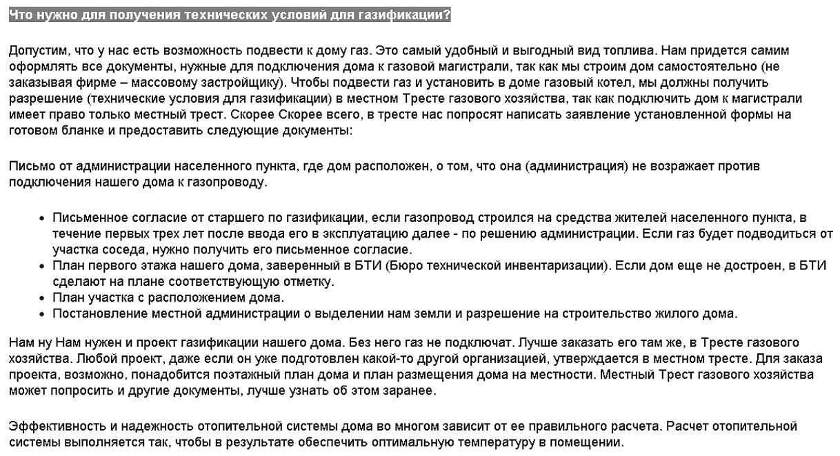 Технические условия на подключение к газа разрабатываются для каждого здания в индивидуальном порядке. Они рассчитываются, в первую очередь, для безопасного пользования абонентом газовыми сетями. Поэтому, в документе содержатся нужные условия, требования к конструкции газового трубопровода и его монтажных частей, к химическому составу топлива и его техническим параметрам, по ограничению влияния на окружающую среду. В связи с тем, что потребителям необходим газ для различных целей (установка газового котла для отопления дома, дополнительного подогрева полов и горячего водоснабжения, для кухонной плиты или все вместе), ТУ будут иметь различия.