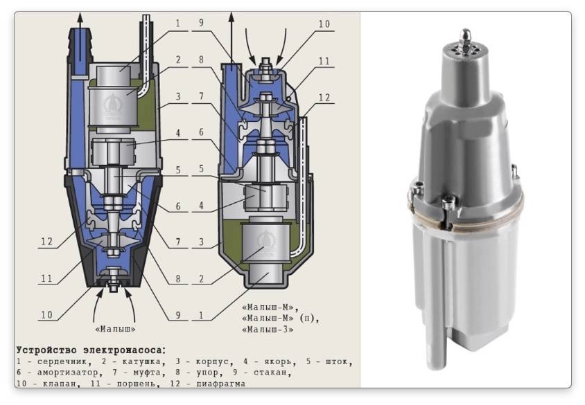 Вибрационный насос Малыш рабочим узлом имеет мембранную камеру. Мембрана представляет собой эластичную перемычку. Питание насоса происходит от сети переменного тока частотой 50 Гц. Электромагнитные колебания с такой же частотой воздействуют при смене полюса на сердечник, заставляя его совершать колебательные движения в осевом направлении. При этом через поплавок сердечник соединен с мембраной. Увеличение объёма водной камеры создает разряжение, вода поступает. При сжатии – выдавливается через клапан. Конструктивно, впуск воды может быть сверху или снизу. Расположение забора определяет применение насоса.