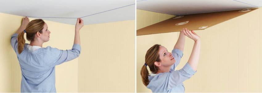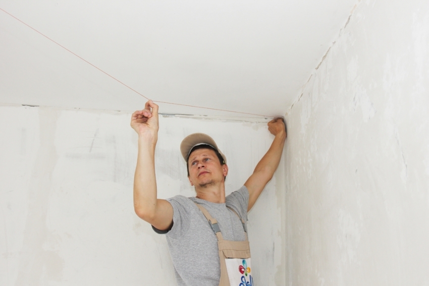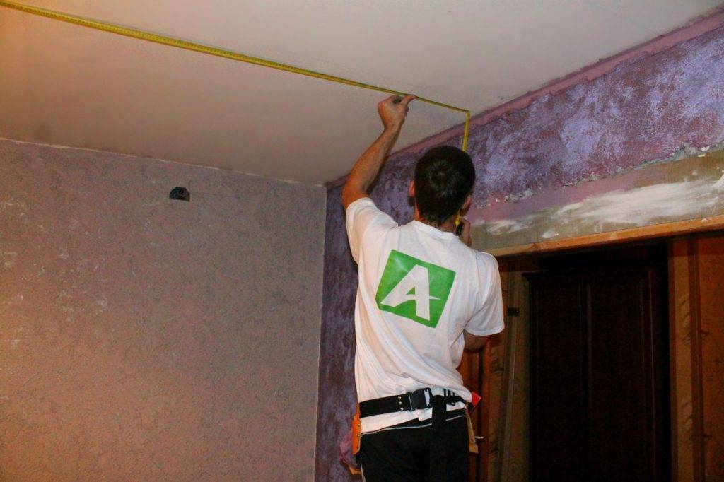 - при помощи строительной рулетки измерить потолок (мерять все 4 стороны, так как из-за строительных недочетов возможны расхождения);