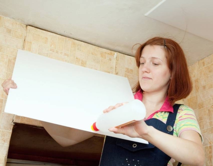 Перед тем как приклеить плитку на потолок, следует нанести специальный клей. В зависимости от выбранного материала он может распределяться по периметру изделия и в центре, или тонким слоем по всей его поверхности