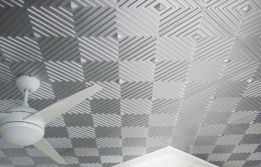- Универсальность. Укладка плитки возможна на любой поверхности – деревянных, бетонных, гипсокартонных или даже стеклянных потолках. Нужен только правильно подобранный клей.