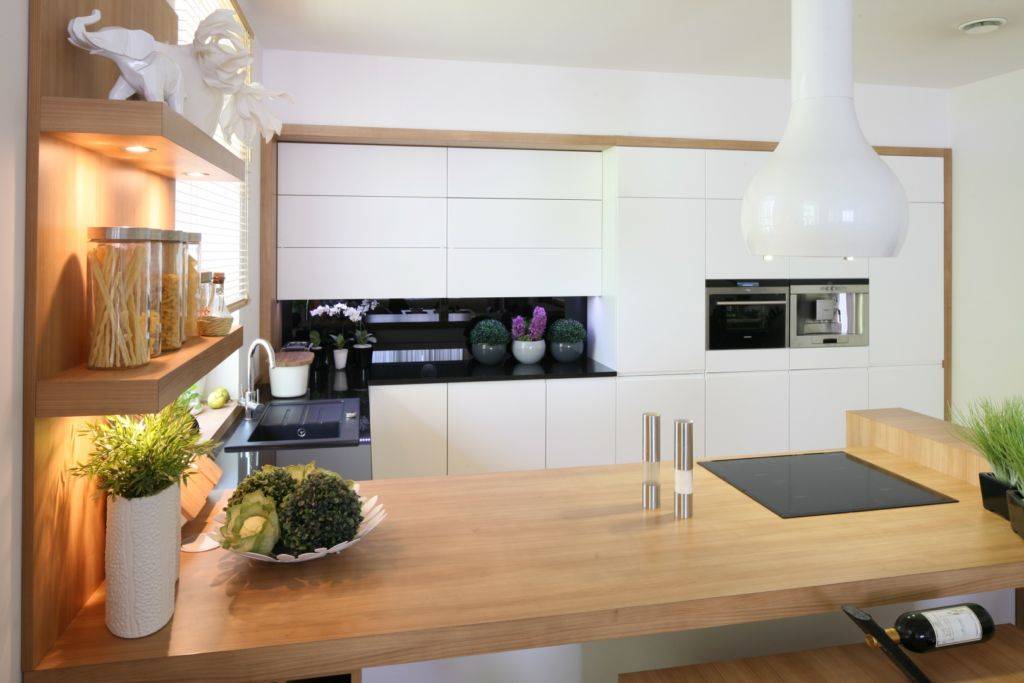 Полочки, встроенные в крайние модули кухонного шкафа, островного гарнитура либо нишу, разнообразят интерьер