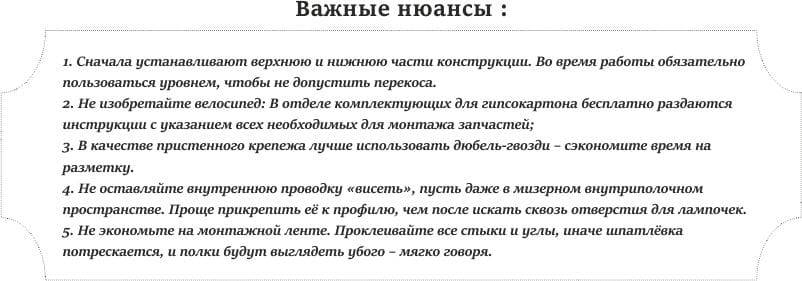 При проектировании изделия нужно учесть ожидаемую нагрузку, размещая на гипсокартонной конструкции такие полезные вещи как телевизор или музыкальные колонки. Полки из гипсокартона на каркасе должны укрепляться профилями изнутри. Если же вы планируете исключительно декоративные полки, то будет достаточно металлического стоечного профиля.