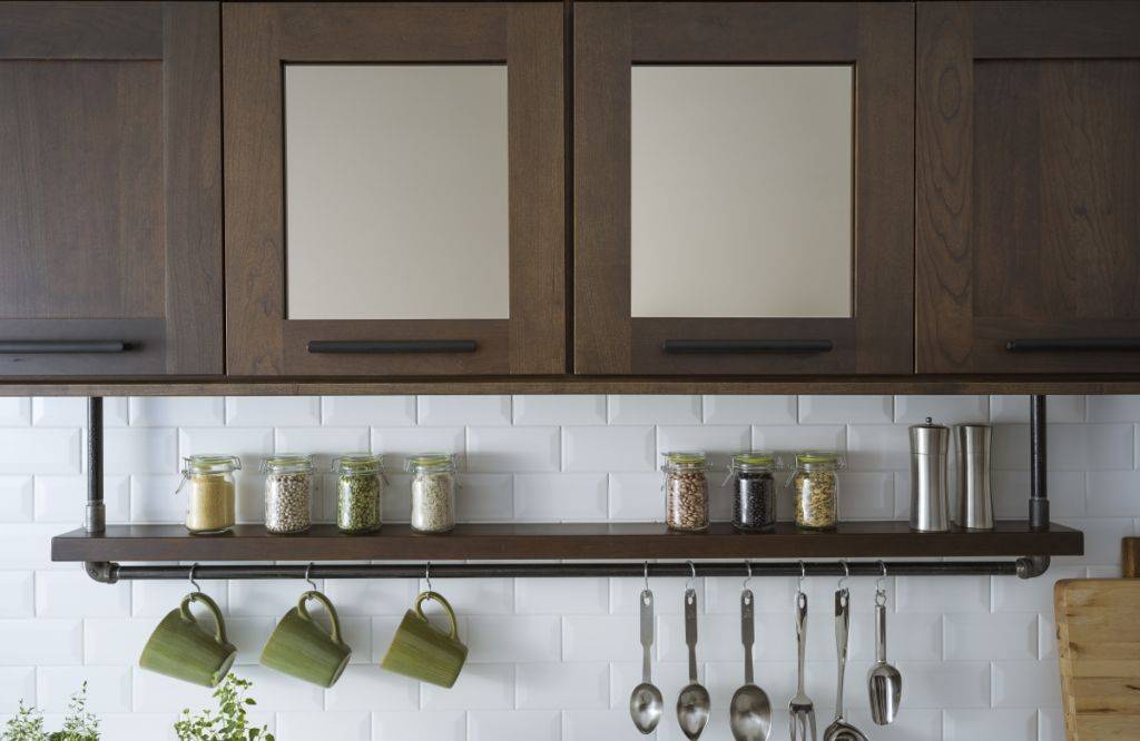 Они располагаются у стенки на столешнице и предоставляют удобное место для кружек, банок со специями или крупами, хлебницы, сахарницы или даже вазы с цветами.