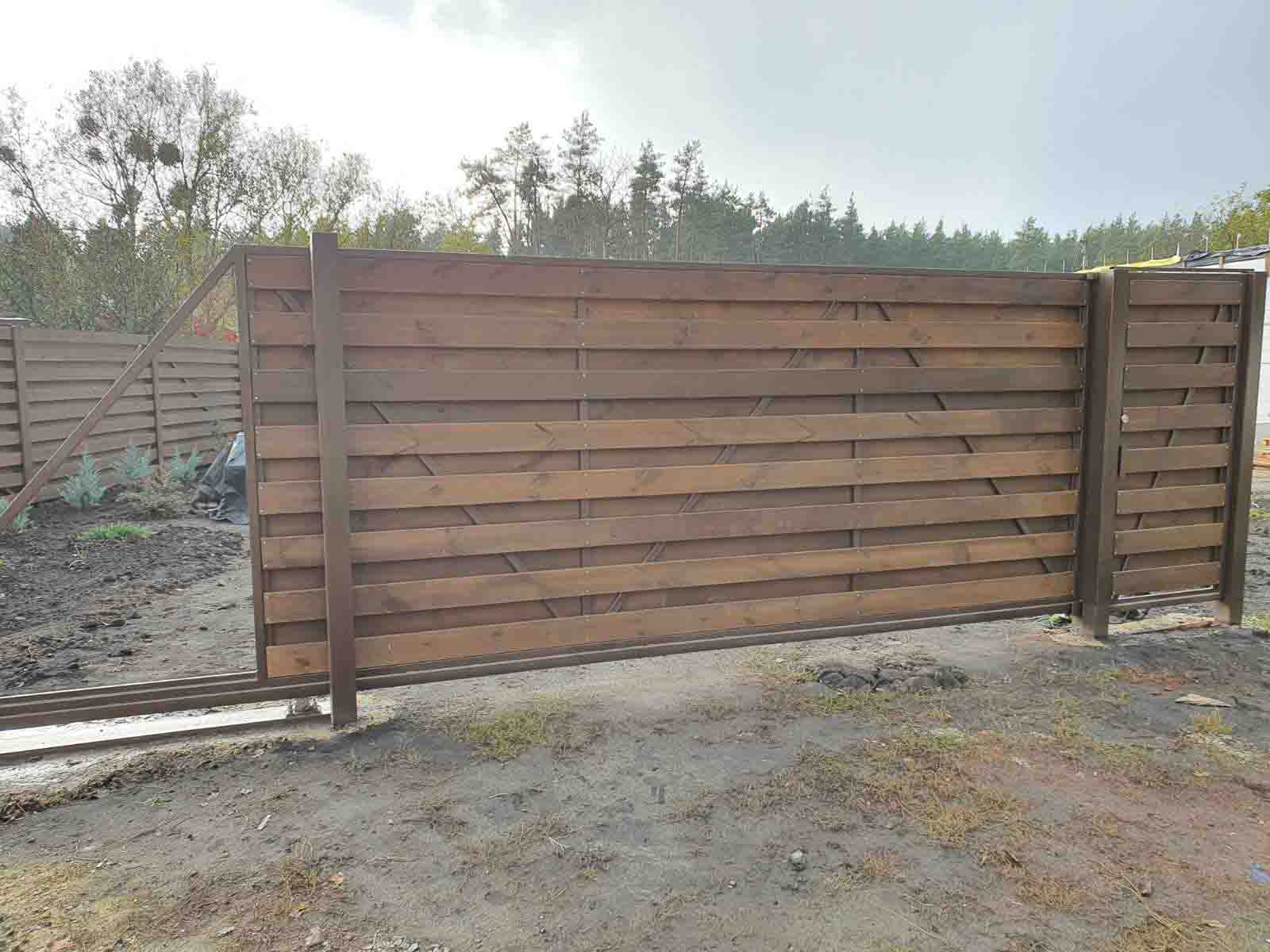 Что касается последней, то чаще всего доски устанавливаются по вертикали. Их верхние торцы можно сделать прямыми, скругленными или придать любую другую формы для повышения декоративности деревянных ворот. Крепление – саморезы или болты.