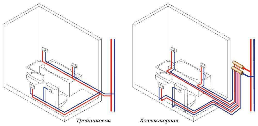 Рассмотрим кратко оба типа разводки труб в ванной комнате.