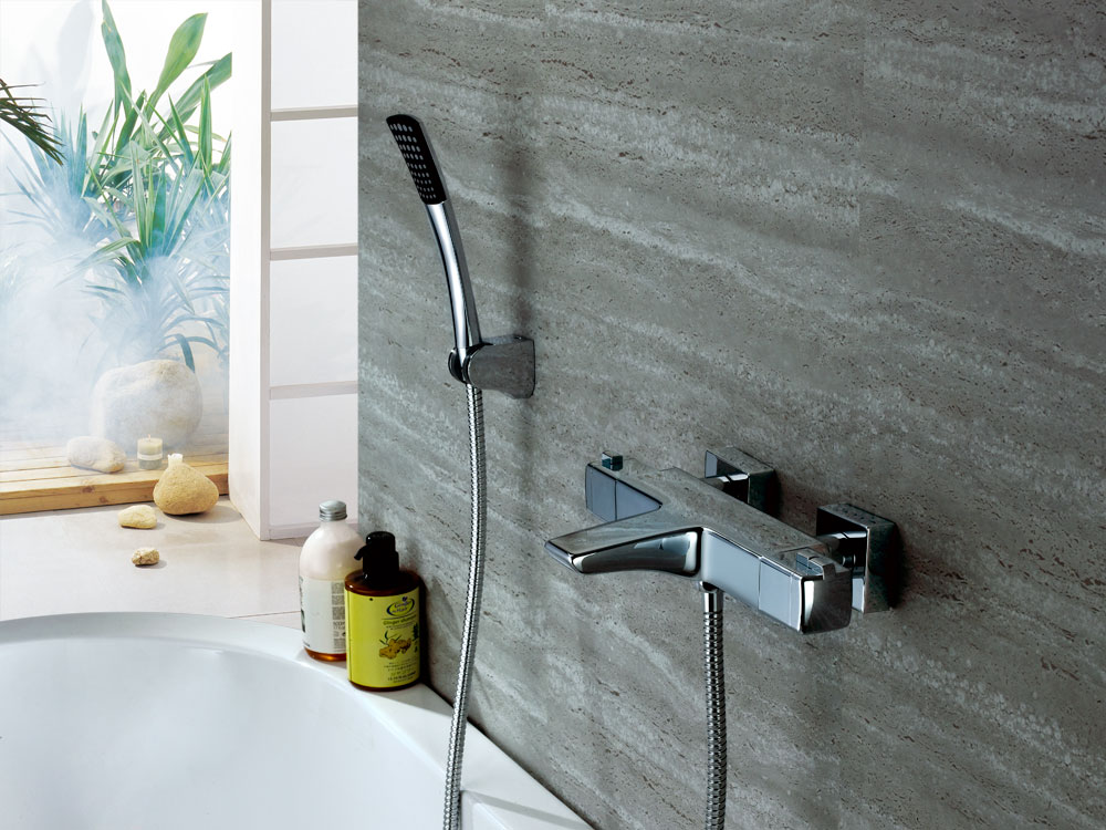 Крепление термостатического смесителя на стену является экономичным и достаточно удобным способом. Монтажом всего одной конструкции обеспечивается возможность использования и ванны, и душа, и раковины.