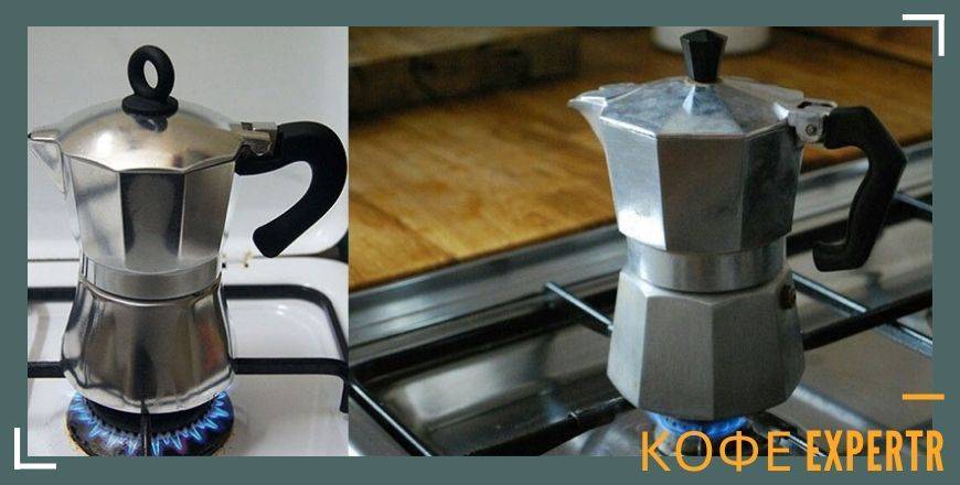 - Поставьте кофеварку греться. Нагрев должен быть слабым, так экстракция будет идти медленнее, и ваш эспрессо получится более интенсивным, ароматным, густым. Если огонь слишком сильный, вы можете за ручку держать кофеварку выше конфорки, тем самым, контролируя температуру.