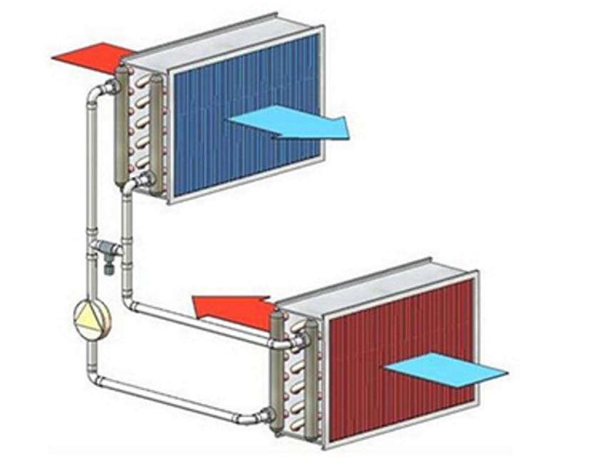 Перенос тепла в низкокипящем хладагенте осуществляется тепловым насосом, интегрированном в вентиляционное оборудование. Оребрённые теплообменники, соединённые фреоновой магистралью с компрессором, размещаются в приточном и вытяжном каналах. Дополнительные затраты электроэнергии в данном случае не требуются, но на обогрев работает только при больших температурных перепадах.