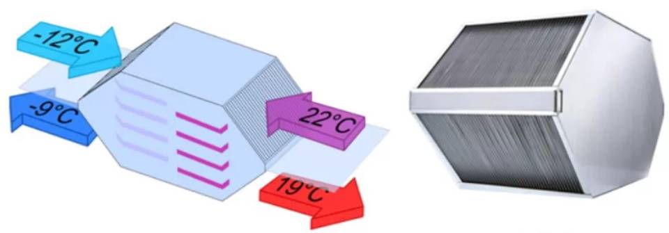 Летом происходит обратный процесс, при котором поступающий воздух уже охлажден. Схема установки такова, что два потока (входящий и исходящий) не смешиваются.