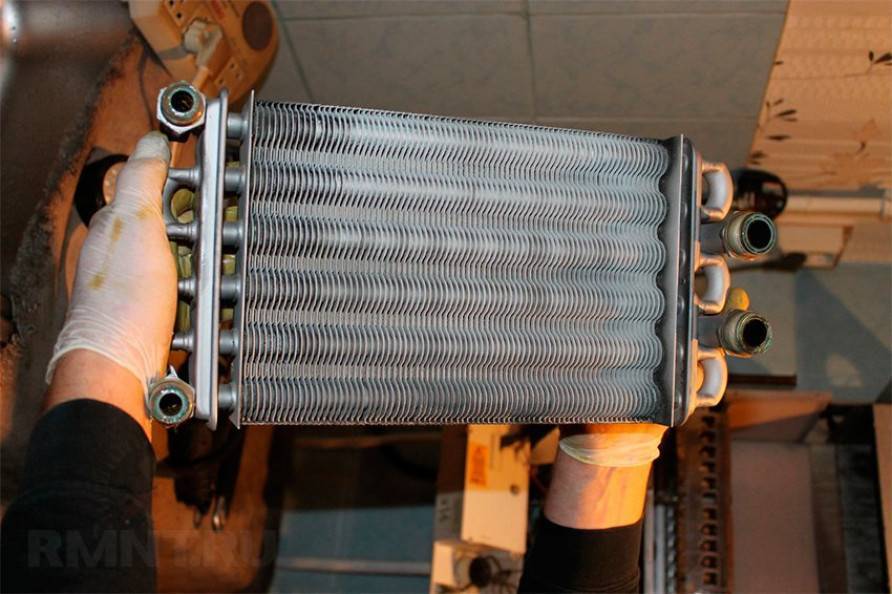 - вытащить теплообменник из раствора и почистить загрязнения ершиком или щеткой;
