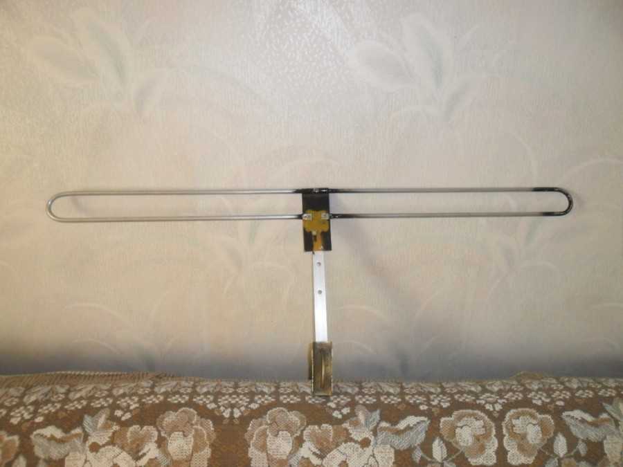 Как видно на фотографии, антенна представляет собой простейший волновой приемник. Для изготовления понадобятся две трубки и телевизионный кабель, а также знание диапазона передачи сигнала ближайшей телевизионной вышки.